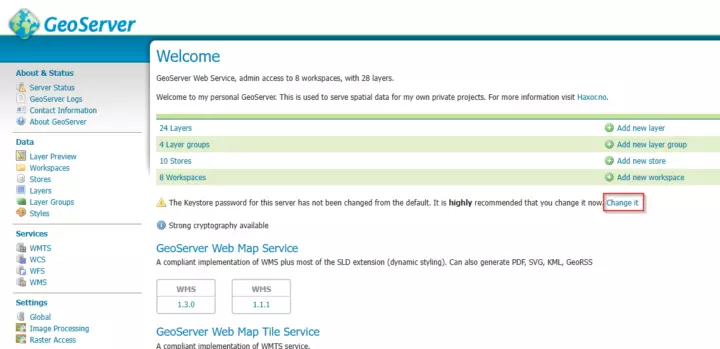 To get an overview of the capabilities of the WMS, navigate to https://geoserver.haxor.no/geoserver/wms?request=GetCapabilities
