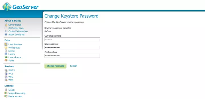 - Use geoserver as the current password, and enter a long, safe password in both fields below.