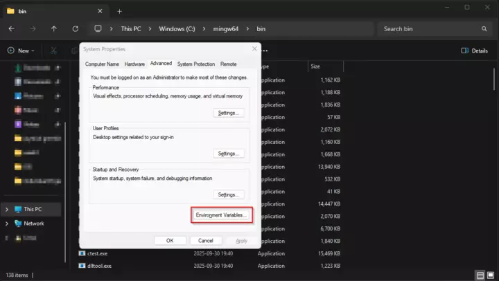 Now, you ned to add the bin diectory to your system PATH variable by first searching for the environment from the start menu, and selecting "Edit the system environment variables". This will open a window that allows you to do so.