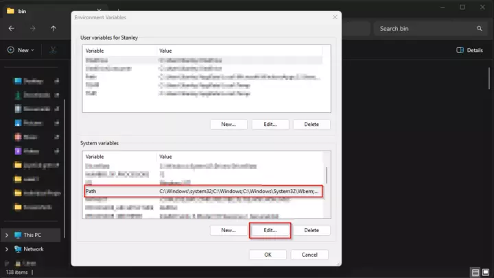Scroll down to the "Path" variable, select it, and click "Edit"