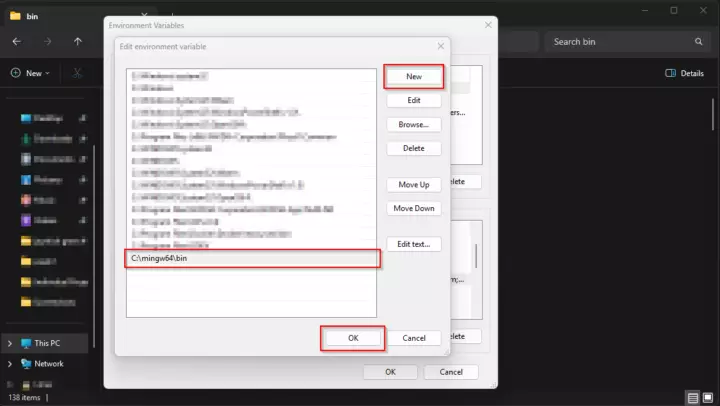Add a new path by clicking on the "New" button, and add the path to the bin directory. Then, click ok to save the changes.